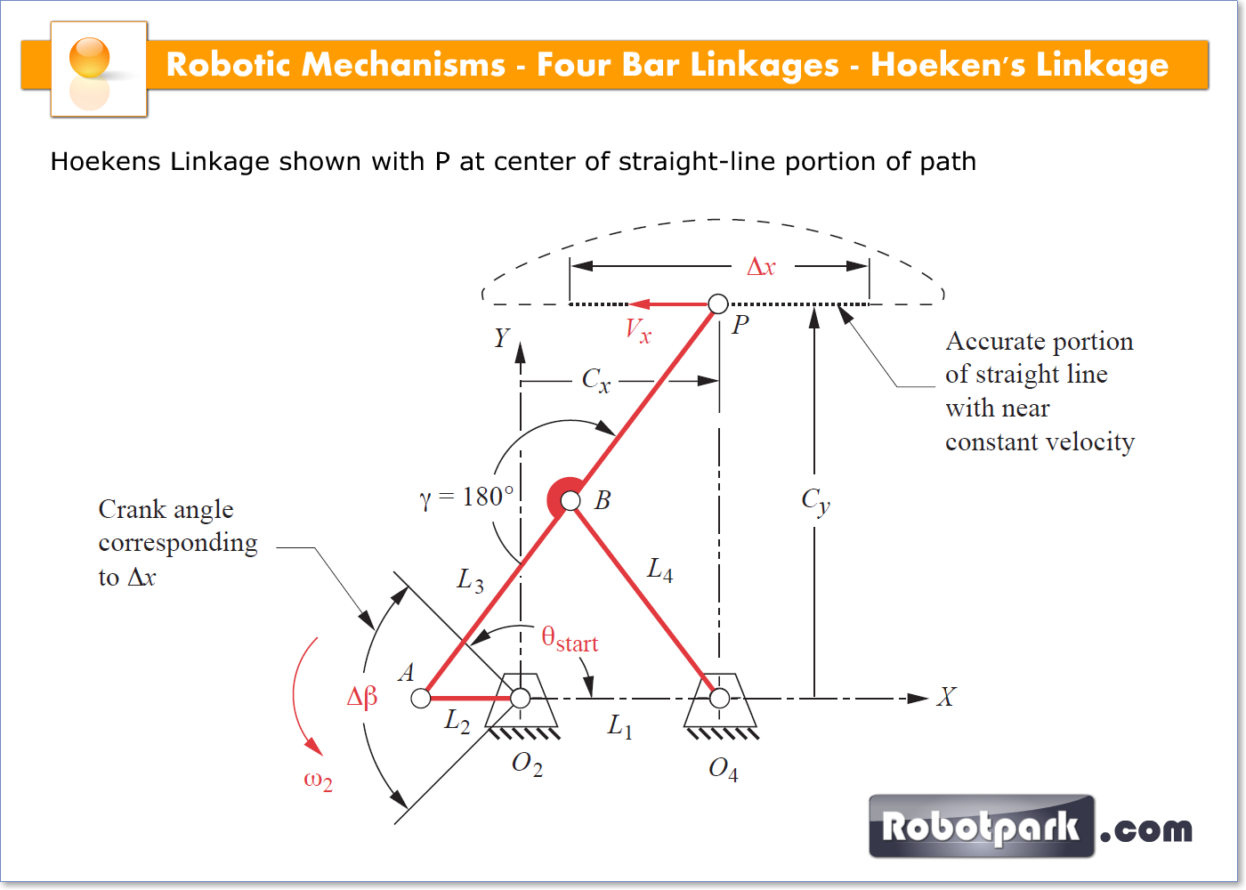 The Hoekens linkage is a four-bar mechanism that converts rotational motion to approximate straight-line motion with approximate constant velocity. The precise design trades off straightness, lack of acceleration, and what proportion of the driving rotation is spent in the linear portion of the full curve.