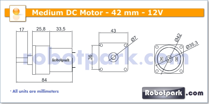 12V 750Rpm 42mm Geared DC Motor is a great choice for projects that need high torque and lower speed. The motor works on 12V DC and its free running current is 0.35A. The stall current of the motor is 2.5A. Shaft diameter of the motor is 7mm and its shaft is 17mm long. Motor length is 86mm and 35mm with and without the gearbox, respectively. Motor diameter is 35mm and it has 4 M4 screw holes for mounting.