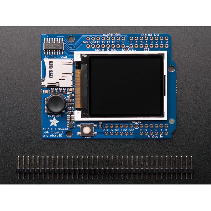 Adafruit 1.8" Color TFT Shield w/microSD and Joystick comes as a fully assembled and tested shield with the display, microSD card holder and nav switch with knob as well as a stick of 0.1” header. To finish up and use, you will need to solder on the header onto the shield PCB, a quick 10 minute task.