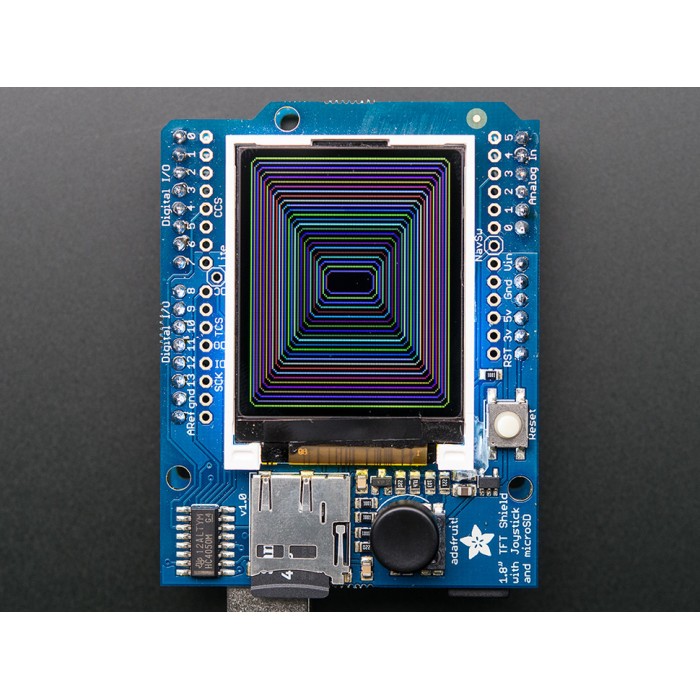 Adafruit 1.8" Color TFT Shield w/microSD and Joystick is the best way to add a small, colorful and bright display to any project. Adafruit took the popular 1.8" TFT breakout board and remixed it into an Arduino shield complete with microSD card slot and a 5-way joystick navigation!