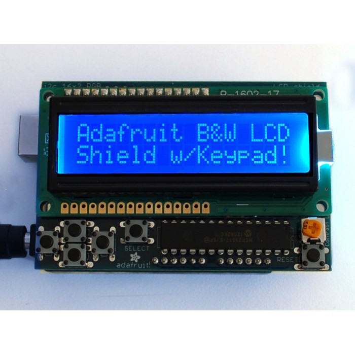 Adafruit LCD Shield Kit w/ 16x2 Character Display - Blue and White is perfect for when you want to build a stand-alone project with its own user interface. The 4 directional buttons plus select button allows basic control without having to attach a bulky computer.