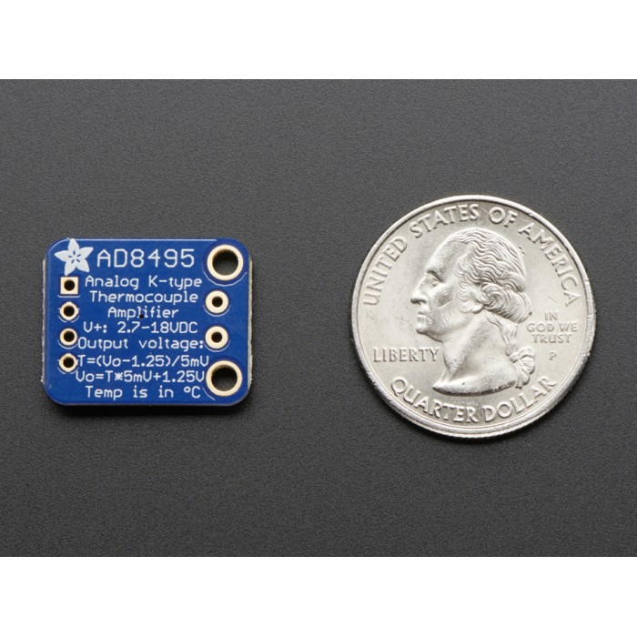 Analog Output K-Type Thermocouple Amplifier - AD8495 Breakout from Analog Devices is so easy to use. The simple documentation is placed on the back of the tiny PCB. Power the board with 3-18VDC and measure the output voltage on the OUT pin. You can easily convert the voltage to temperature with the following equation: