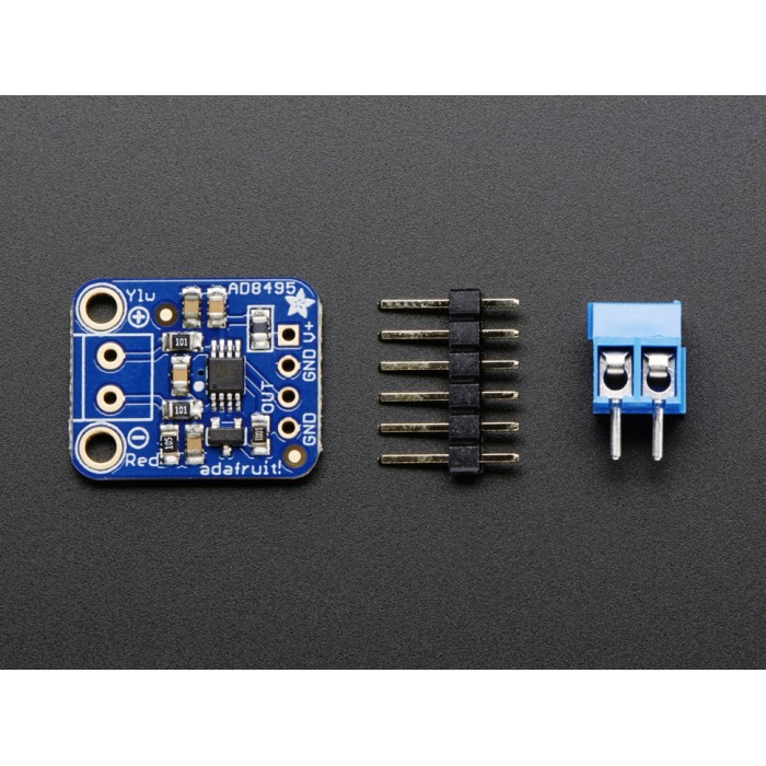 Analog Output K-Type Thermocouple Amplifier - AD8495 Breakout comes with a 2 pin terminal block (for connecting to the thermocouple), a fully assembled PCB with the AD8495 + TLVH431 1.25V precision voltage reference, and pin header (to plug into any breadboard or perfboard).