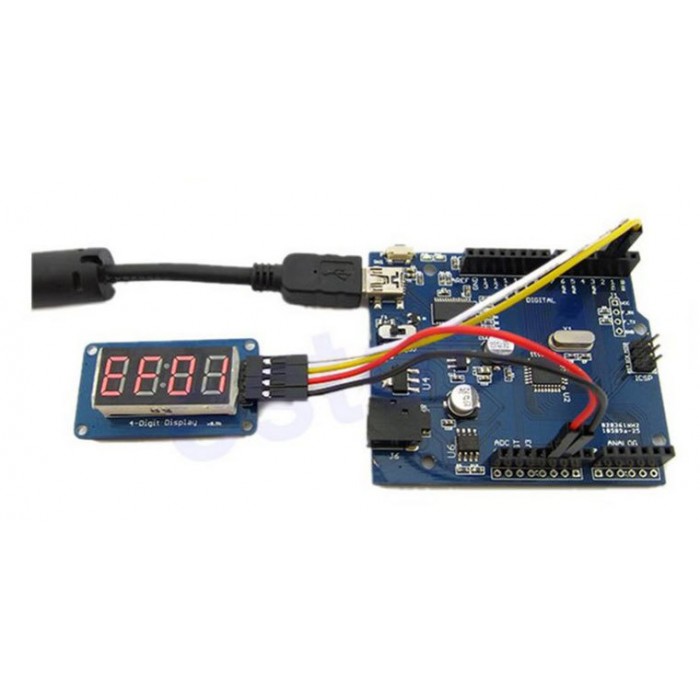 With this 4 digit Seven segment display module, you can easily add a 4 number LED readout to your projects. Useful for making a clock, timer, temperature readout, etc. Just connect 2 pins to your Arduino, Raspberry Pi, or other microcontroller and control all of the LEDs serially! Save tons of wiring space and have a lovely display that even includes the ':' between the numbers for a clock readout. Lights up red!