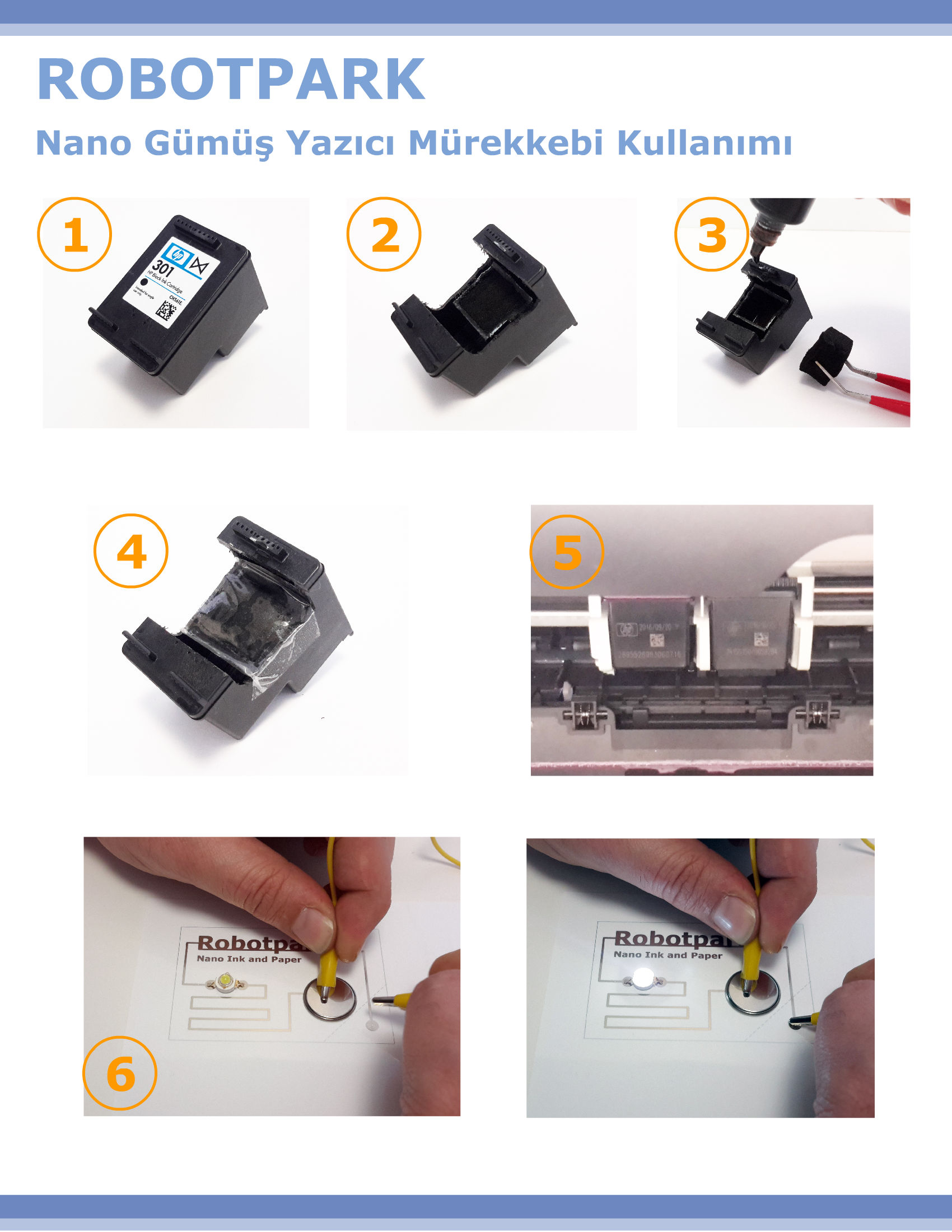 Robotpark tarafından geliştirilen Gümüş Nano Yazıcı Mürekkebi printer kartuşu uyumlu bir iletken mürekkeptir. Robotpark Gümüş Nano Yazıcı Mürekkebi ile devrelerinizi bir yazıcı ile kolayca basabilir veya kalemi ile kendiniz çizebilirsiniz. Özel baskı kağıtlarına bastığınız devreleri hızlıca kullanabilirsiniz.