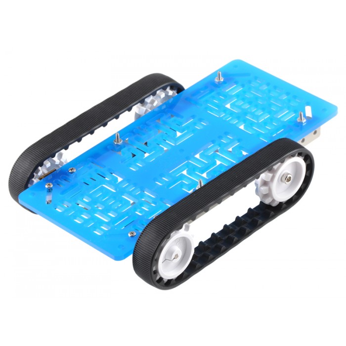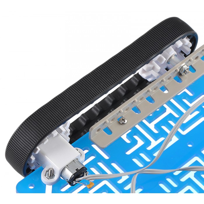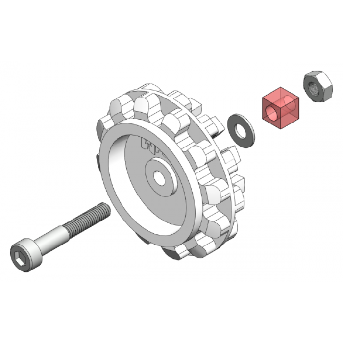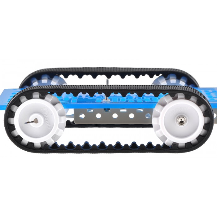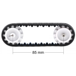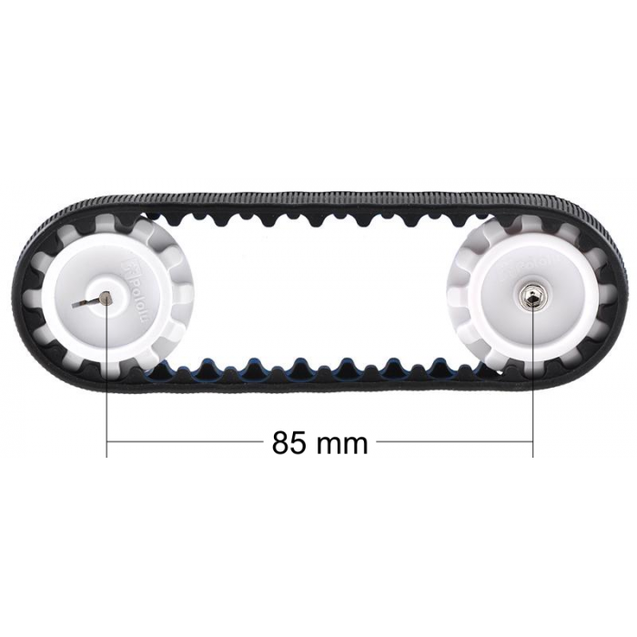 Pololu 30T Track Set includes a pair of 30-tooth silicone tracks, two drive sprockets measuring 1.38" (35 mm) in diameter, and two matching idler sprockets along with mounting hardware. The drive sprockets are designed to work with 3mm D-shafts.