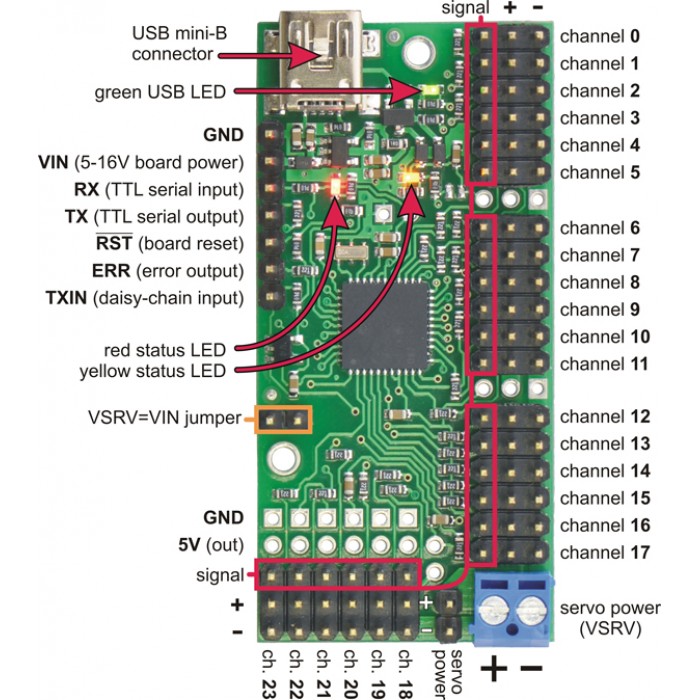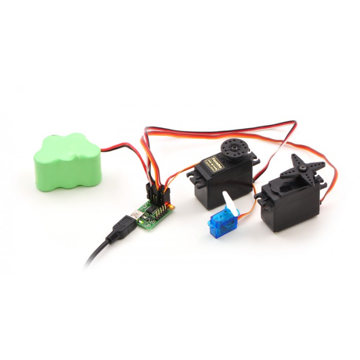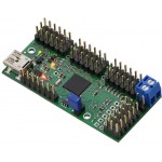 Pololu Mini Maestro 24 -Channel USB Servo Controller is a highly versatile (and compact) servo controller and general-purpose I/O board. It supports three control methods: USB for direct connection to a computer, TTL serial for use with embedded systems, and internal scripting for self-contained, host controller-free applications. The channels can be configured as servo outputs for use with radio control (RC) servos or electronic speed controls (ESCs), as digital outputs, or as analog/digital inputs. The extremely precise, high-resolution servo pulses have a jitter of less than 200 ns, making these servo controllers well suited for high-performance applications such as robotics and animatronics, and built-in speed and acceleration control for each channel make it easy to achieve smooth, seamless movements without requiring the control source to constantly compute and stream intermediate position updates to the Mini Maestros. The Mini Maestros also feature configurable pulse rates from 1 to 333 Hz and can generate a wide range of pulses, allowing maximum responsiveness and range from modern servos.