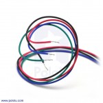 The motor has four color-coded wires terminated with bare leads: black and green connect to one coil; red and blue connect to the other. It can be controlled by a pair of suitable H-bridges (one for each coil), but we recommend using a bipolar stepper motor driver.