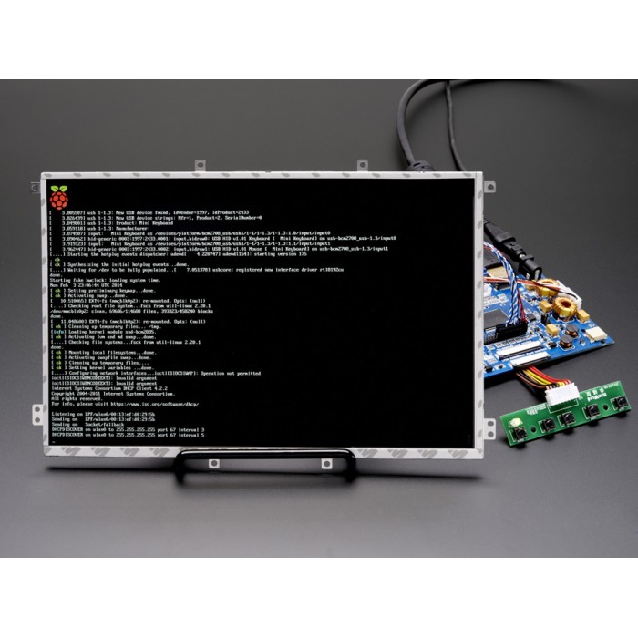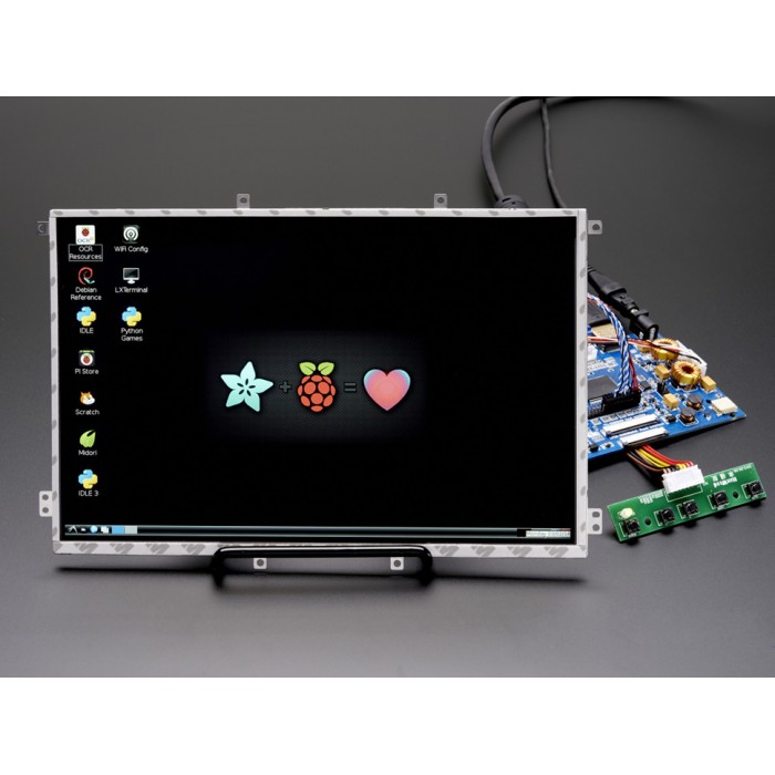 Make an audio/video setup with a 10.1" IPS screen with HDMI stereo speaker support. We include a driver board with HDMI, VGA and Composite inputs as well as stereo 4 ohm at 3W output driving capability. There's a little wired PCB with little buttons that let you enter a menu system for adjusting brightness, color and contrast. It tried to auto-detect which input you have and switches to that one or you can 'select' from the menu which to display.