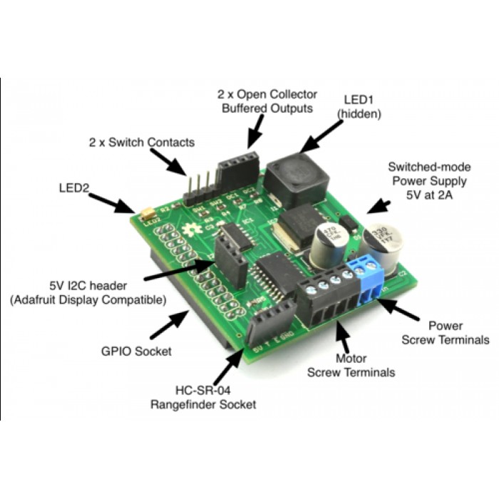 The board fits right on top of your Pi's GPIO socket and allows for bi-directional control of both motors with an L293D H-Bridge motor driver chip. It also allows for control of both motor's speed independently and to use lower voltage motors than the voltage of your battery pack. The board can also supply the Raspberry Pi with up to 2 amps of power using a switch mode power supply, allowing you to run a fully-loaded Pi and the robot from 6xAA batteries