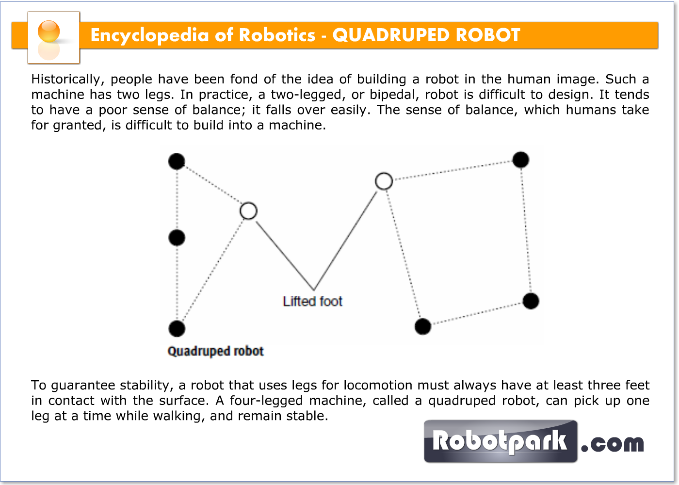 To guarantee stability, a robot that uses legs for locomotion must always have at least three feet in contact with the surface. A four-legged machine, called a quadruped robot, can pick up one leg at a time while walking, and remain stable. The only problem occurs when the three surface-bound legs lie on or near a common line, as shown on the left side of the illustration. Under these conditions, a four-legged object can topple.